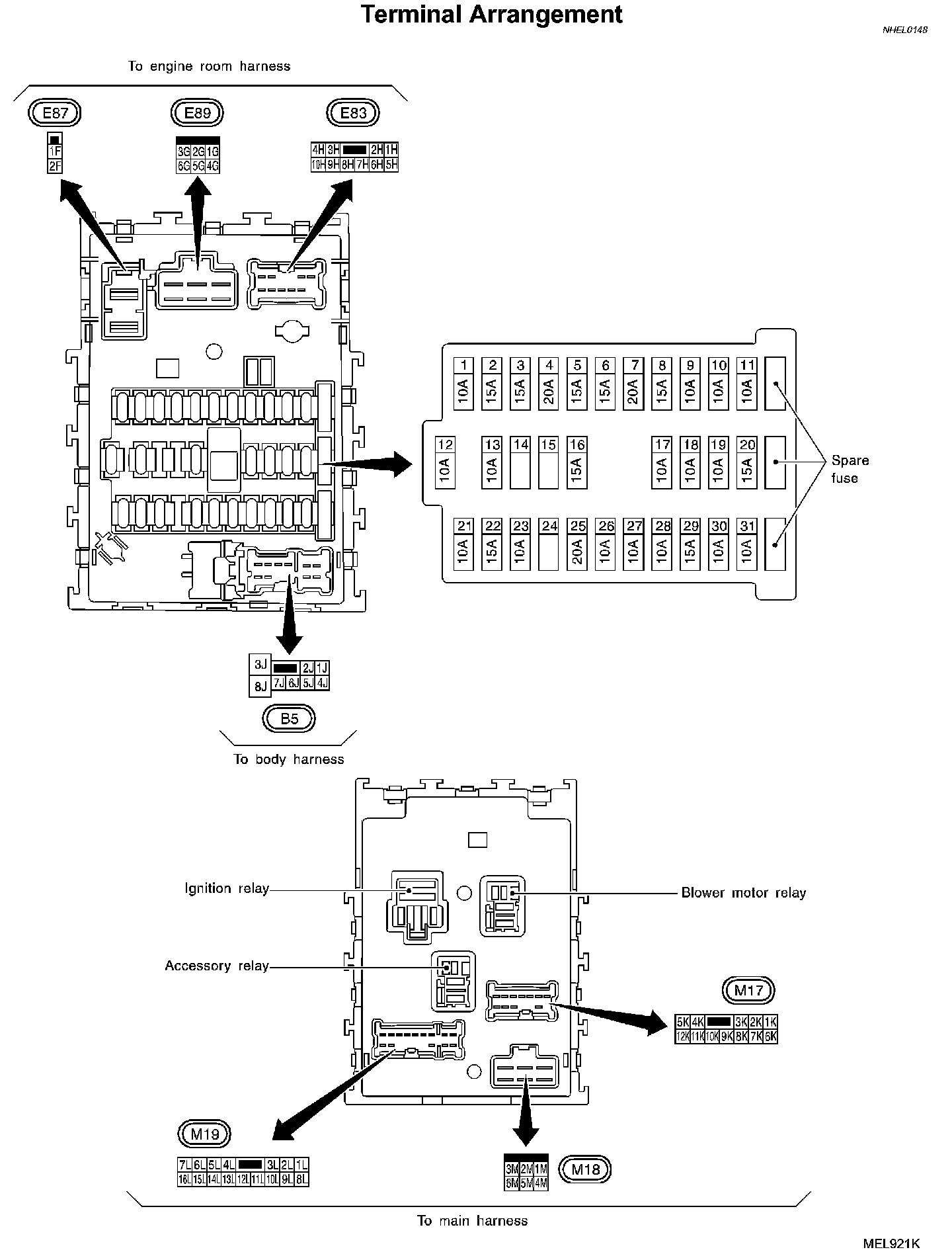 Fuse Block - Junction Box (J/B) - Terminal Arrangement: