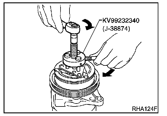 When replacing compressor clutch assembly, always carry out the break-in operation. This is done by engaging and disengaging the clutch about thirty times. Break-in operation raises the level of transmitted torque.