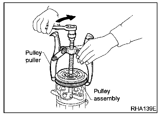 To prevent the pulley groove from being deformed, the puller claws should be positioned onto the edge of the pulley assembly.