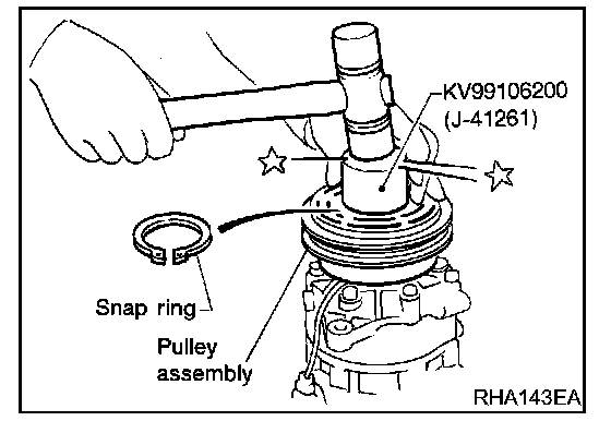- Install the pulley assembly using the installer and a hand press, and then install the snap ring using snap ring pliers.