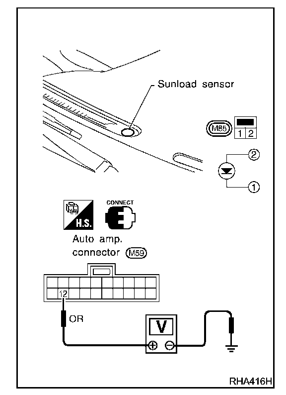 Measure voltage between auto amp. terminal 12 and body ground. If NG, replace sunload sensor.