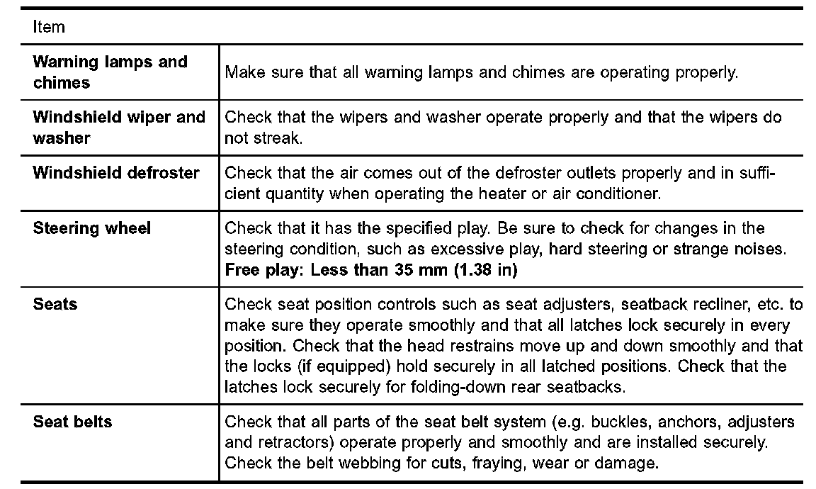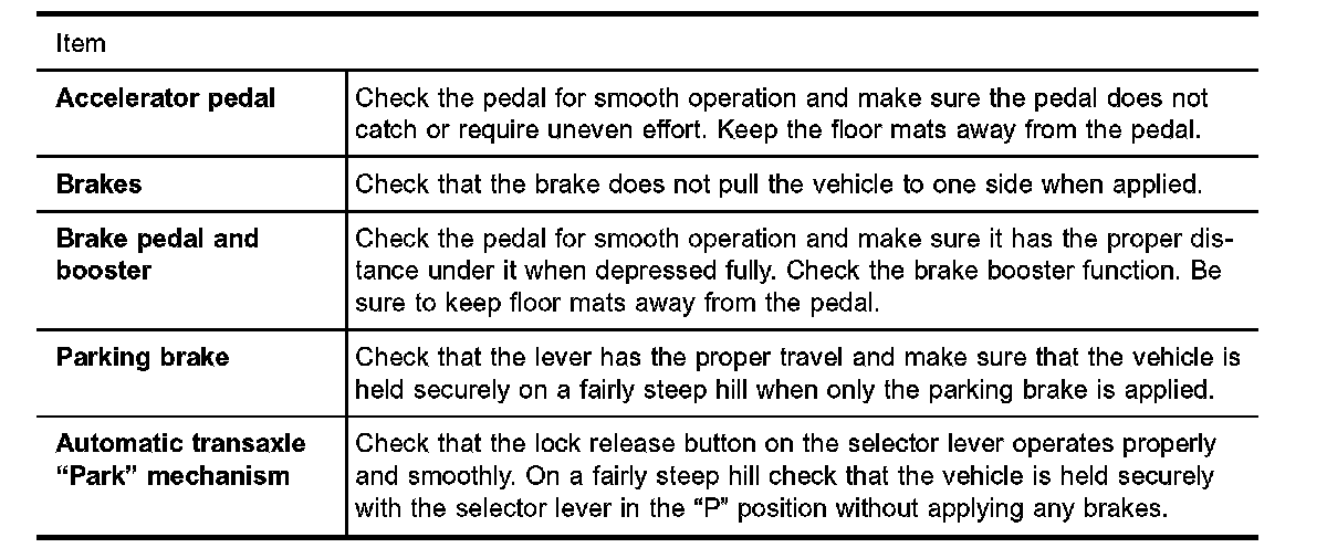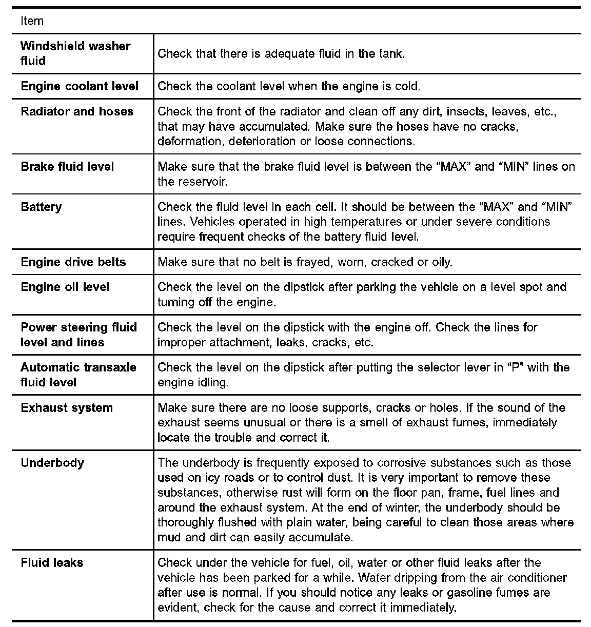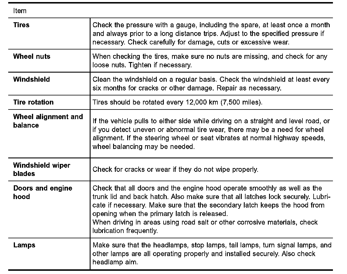 The maintenance items listed here should be checked on a regular basis, such as when performing periodic maintenance, cleaning the vehicle, etc.