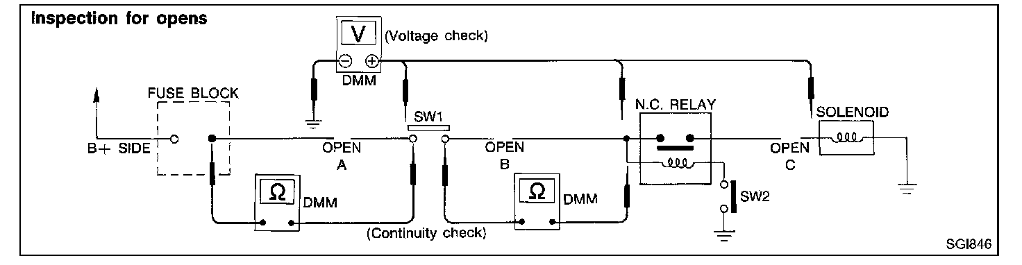 5. Close SW1 and disconnect the relay. Put probes at the load side of fuse terminal and a known good ground. Then check for continuity.