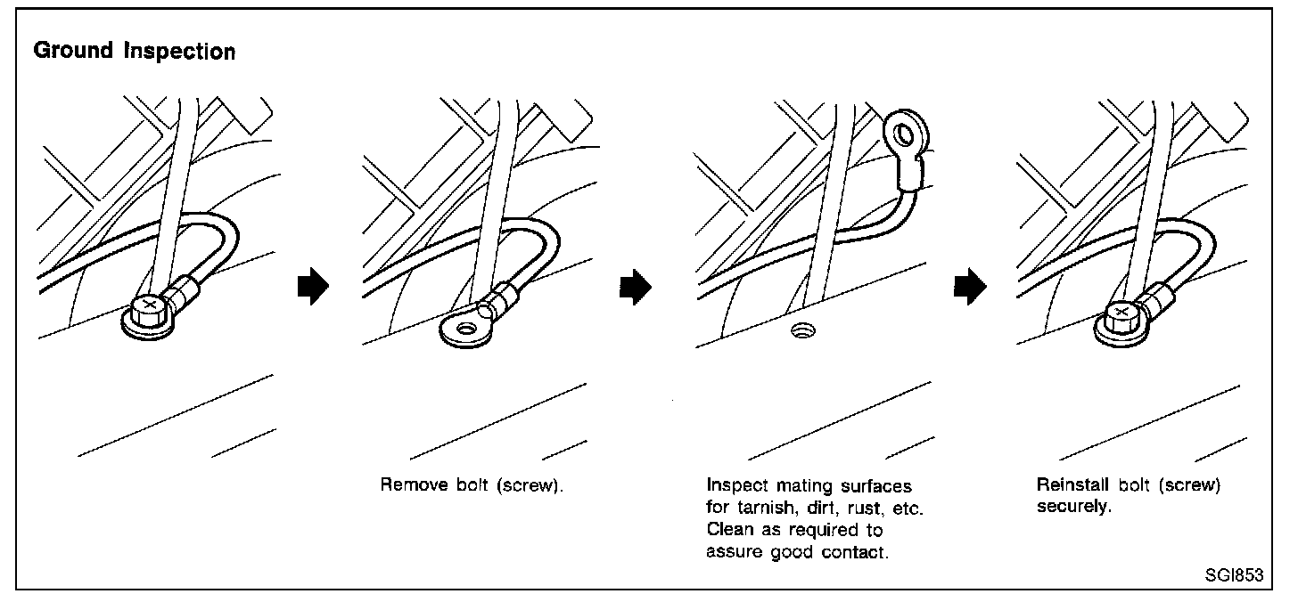 To inspect components under the hood start by verifying the integrity of ground connections. (Refer to GROUND INSPECTION described later.) First check that the system is properly grounded. Then check for loose connection by gently shaking the wiring or components as previously explained. Using the wiring diagrams inspect the wiring for continuity.