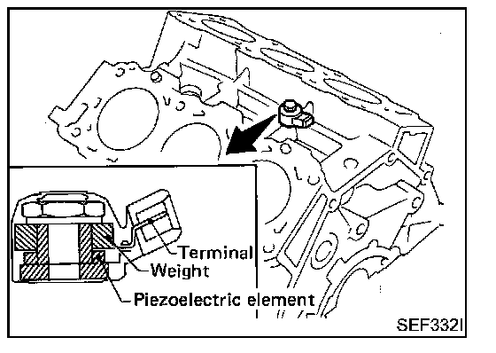 Component DescriptionThe knock sensor is attached to the cylinder block. It senses engine knocking using a piezoelectric element. A knocking vibration from the cylinder block is sensed as vibrational pressure. This pressure is converted into a voltage signal and sent to the ECM.