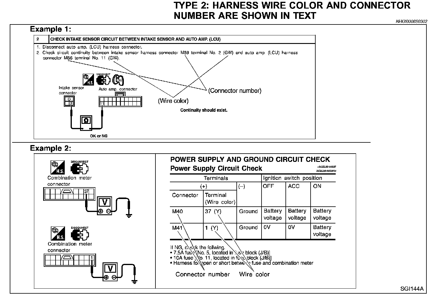 TYPE 2: HARNESS WIRE COLOR AND CONNECTOR NUMBER ARE SHOWN IN TEXT