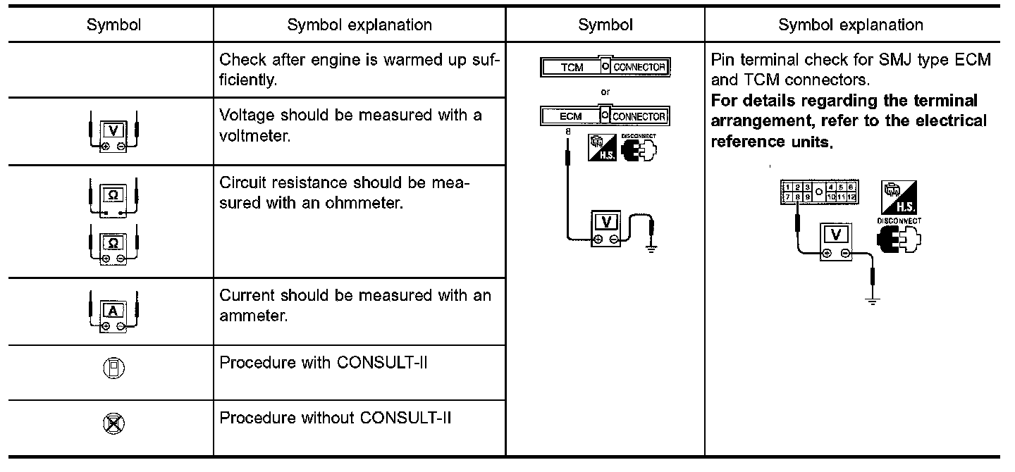 Symbols included in illustrations refer to measurements or procedures. Before diagnosing a problem familiarize yourself with each symbol. Refer to "CONNECTOR SYMBOLS" and "Key to Symbols Signifying Measurements or Procedures".
