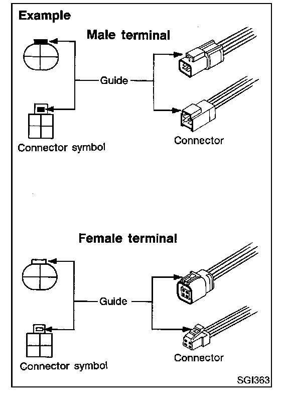 Connector guides for male terminals are shown in black and female terminals in white in wiring diagrams.