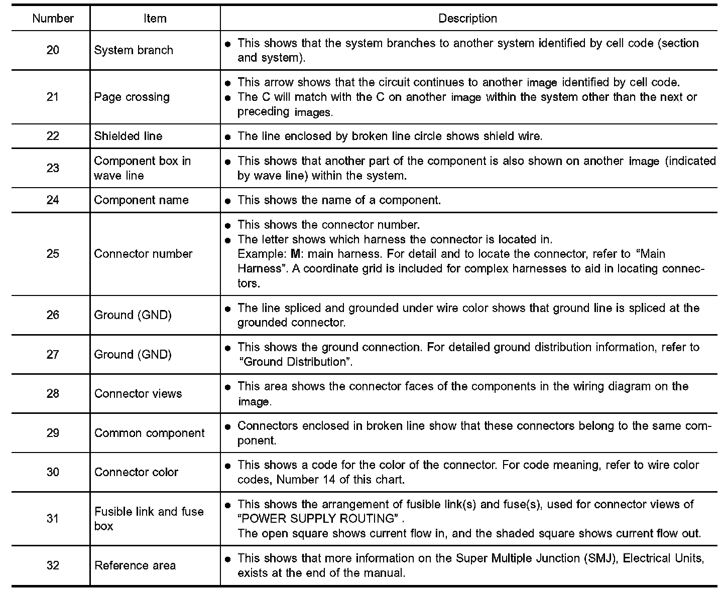 - Connector symbols shown from the harness side are enclosed by a double line and followed by the direction mark.