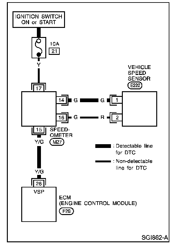 - A line with regular weight (wider line) represents "a detectable line for DTC (Diagnostic Trouble Code)". "A detectable line for DTC" is a circuit in which ECM can detect its malfunctions with the on board diagnostic system.