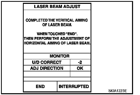 9. When "U/D CORRECT" value indicates ±4, confirm that the margin of value remains within ±4 at least for 2 seconds with no equipment or hand touching the ICC sensor. When "COMPLETED THE VERTICAL AIMING OF LASER BEAM" appears on screen, touch "END".