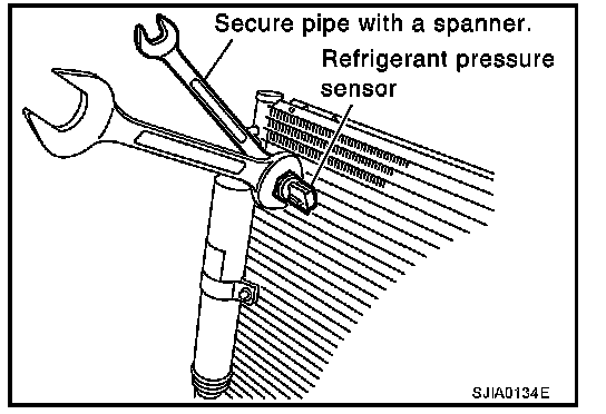 - Secure refrigerant pressure sensor installation pipe with an open-end wrench. Be careful not to deform pipe during the operation.