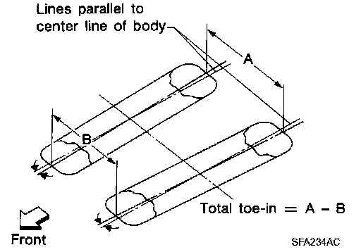 Measure toe-in using following procedure. If out of specification, inspect and replace any damaged or worn rear suspension parts.