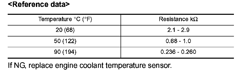 ENGINE COOLANT TEMPERATURE SENSOR1. Check resistance between engine coolant temperature sensor terminals 1 and 2 as shown in the figure.
