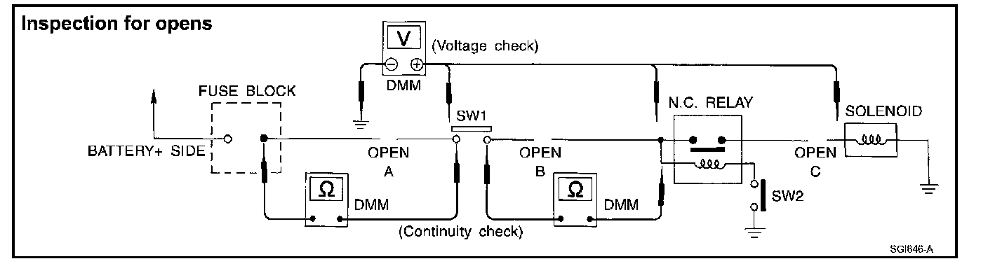 - With SW1 open probe at SW1 to check for voltage. voltage; open is further down the circuit than SW1. no voltage; open is between fuse block and SW1 (point A).
