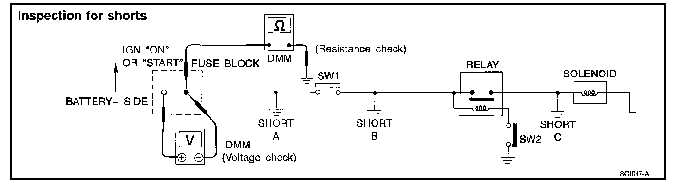- Connect the other probe to the fuse block (power) side of SW1. Little or no resistance will indicate that portion of the circuit has good continuity. If there were an open in the circuit, the DMM would indicate an over limit or infinite resistance condition. (point A)