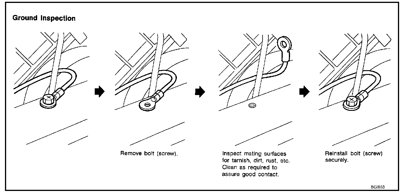 To inspect components under the hood start by verifying the integrity of ground connections. (Refer to Ground Inspection described later.) First check that the system is properly grounded. Then check for loose connection by gently shaking the wiring or components as previously explained. Using the wiring diagrams inspect the wiring for continuity.