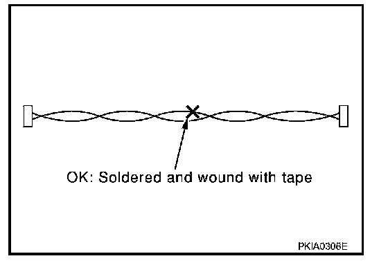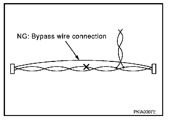 - Do not perform bypass wire connections for the repair parts. (The spliced wire will become separated and the characteristics of twisted line will be lost.)