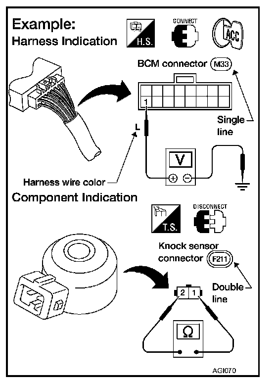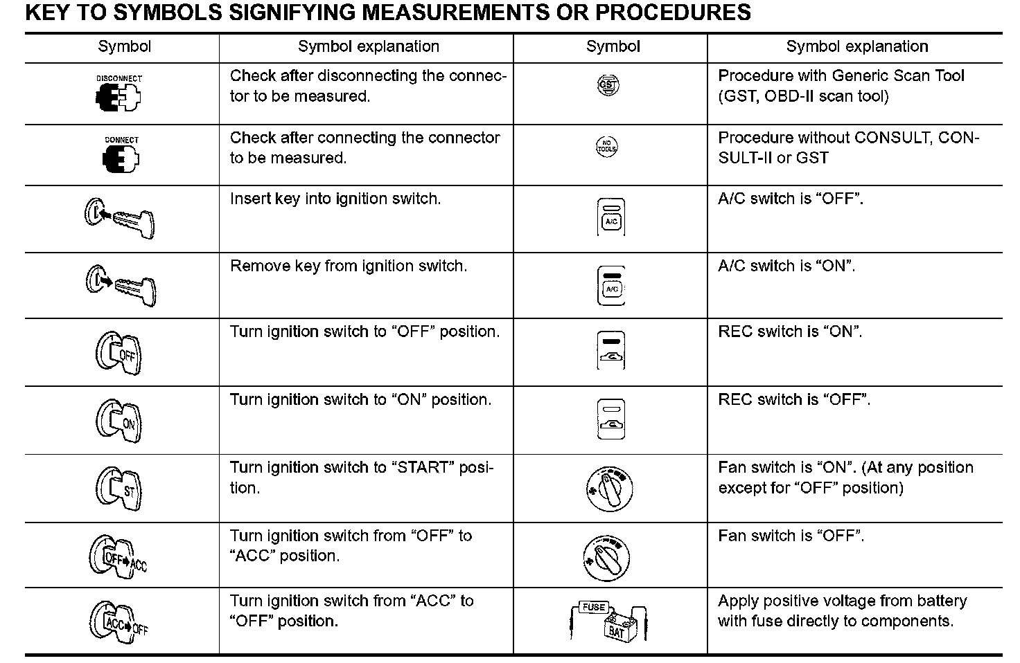 Symbols included in illustrations refer to measurements or procedures. Before diagnosing a problem familiarize yourself with each symbol. Refer to "Connector Symbols" and "KEY TO SYMBOLS SIGNIFYING MEASUREMENTS OR PROCEDURES".