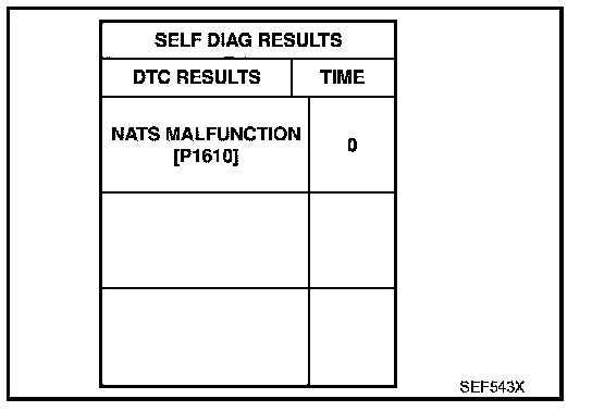 IVIS (Infiniti Vehicle Immobilizer System - NATS)- If the security indicator lights up with the ignition switch in the "ON" position or "NATS MALFUNCTION" is displayed on "SELF-DIAG RESULTS" screen, perform self-diagnostic results mode with CONSULT-II using NATS program card. Refer to "IVIS (INFINITI VEHICLE IMMOBILIZER SYSTEM-NATS)". Antitheft and Alarm Systems