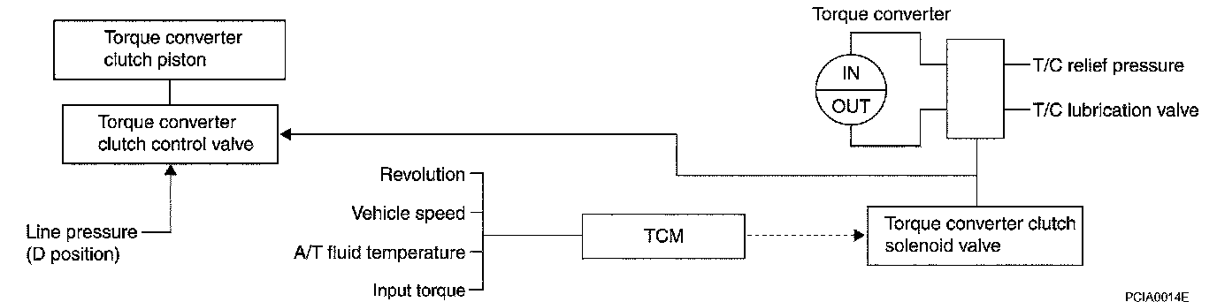 The torque converter clutch control valve operation is controlled by the torque converter clutch solenoid valve, which is controlled by a signal from TCM, and the torque converter clutch control valve engages or releases the torque converter clutch piston.