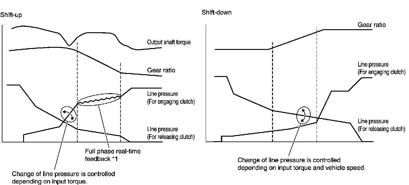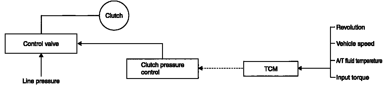 Shift ControlThe clutch pressure control solenoid is controlled by the signals from the switches and sensors. Thus, the clutch pressure is adjusted to be appropriate to the engine load state and vehicle driving state. It becomes possible to finely control the clutch hydraulic pressure with high precision and a smoother shift change characteristic is attained.