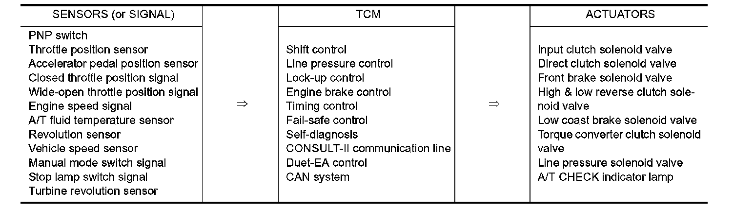 The automatic transmission senses vehicle operating conditions through various sensors or signals. It always controls the optimum shift position and reduces shifting and lock-us shocks.