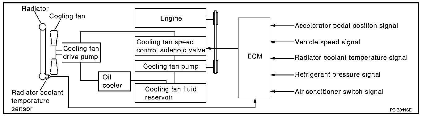 The ECM controls the cooling fan speed corresponding to the engine speed, the radiator coolant temperature, refrigerant pressure, vehicle speed, air conditioner switch signal, etc.