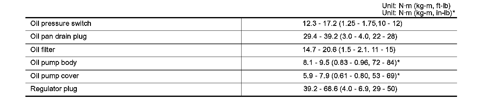 Oil pan drain plug 29.4 - 39.2 Nm (3.0 - 4.0 kg-m, 22 - 28 ft. lbs.)