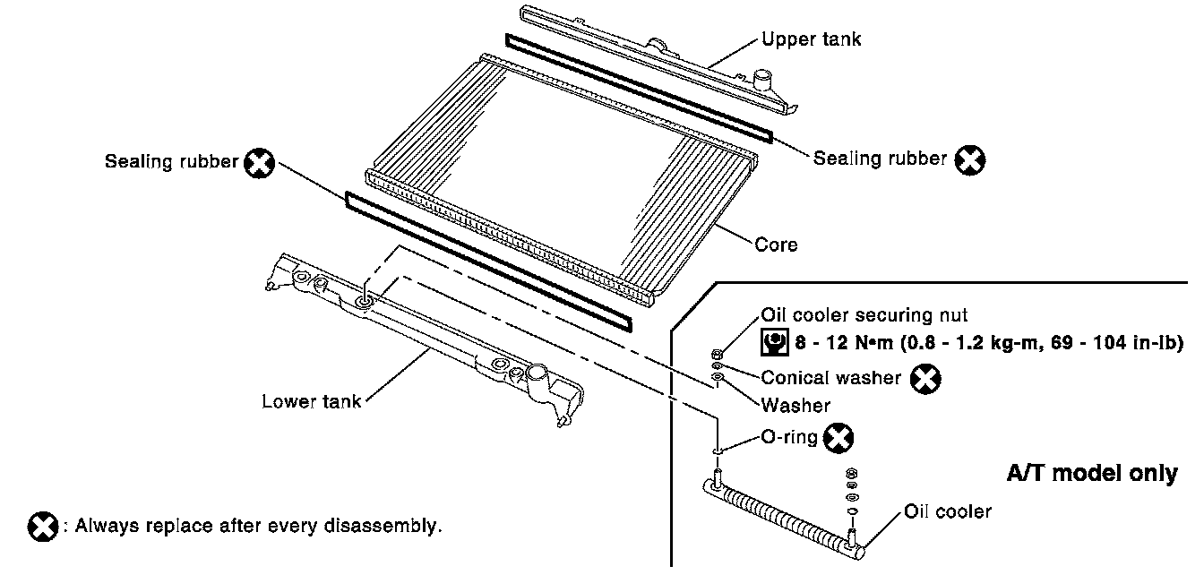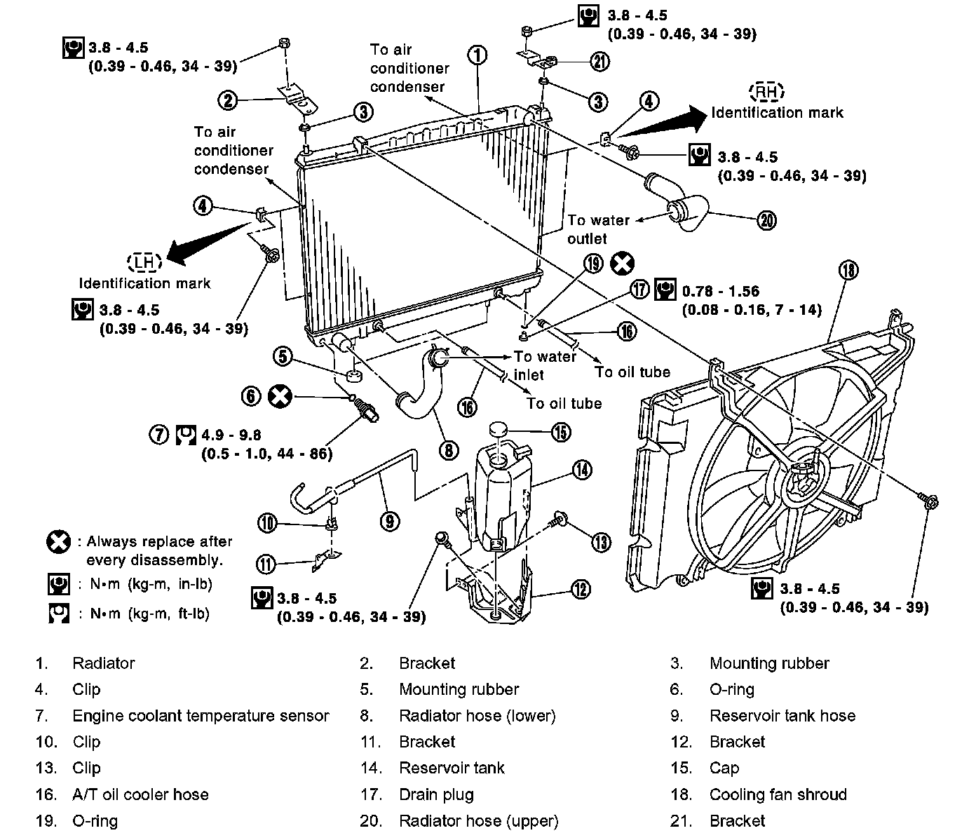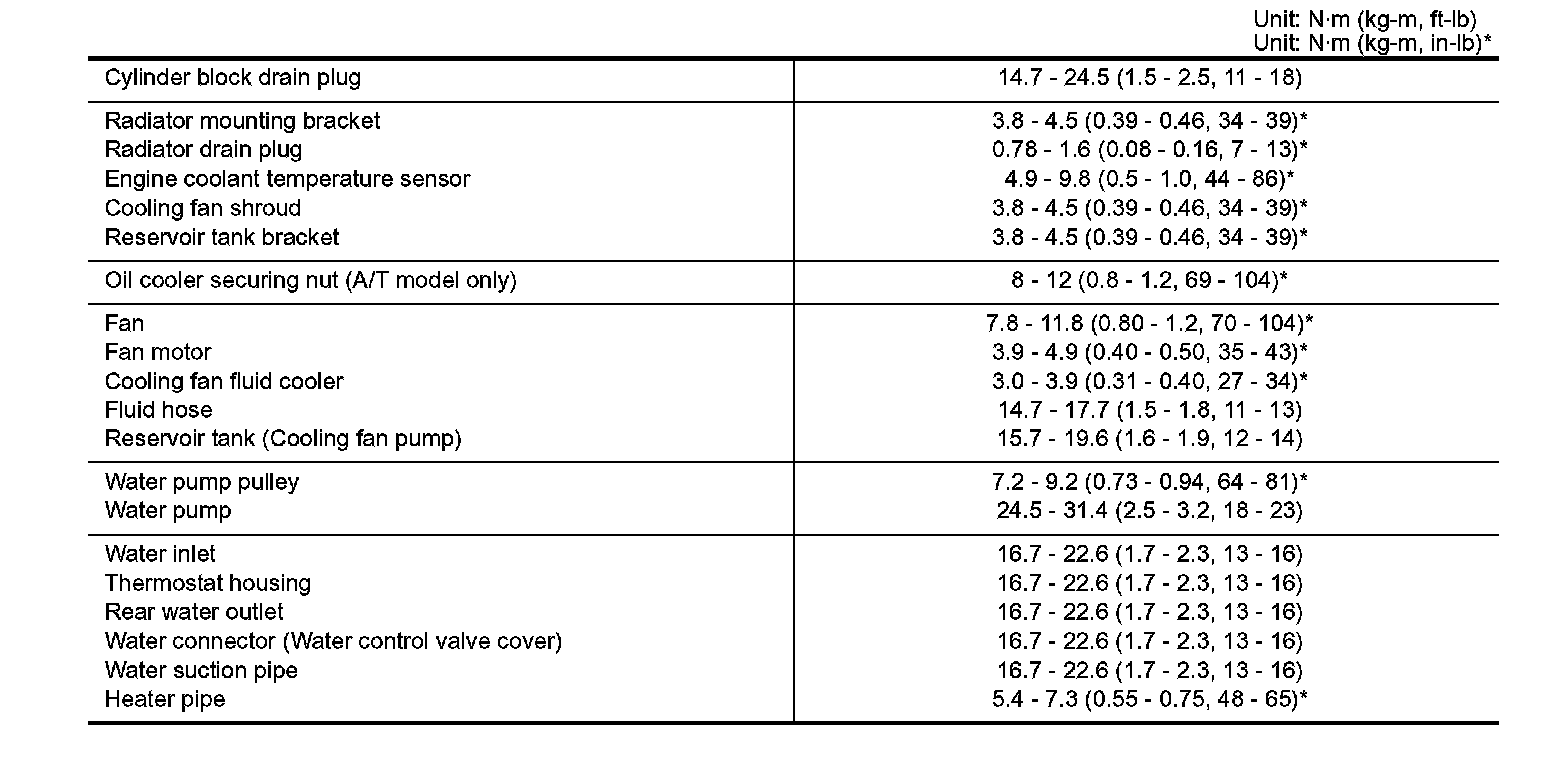 Reservoir tank (Cooling fan pump) 15.7 - 19.6 Nm (1.6 - 1.9 kg-m, 12 - 14 ft. lbs.)