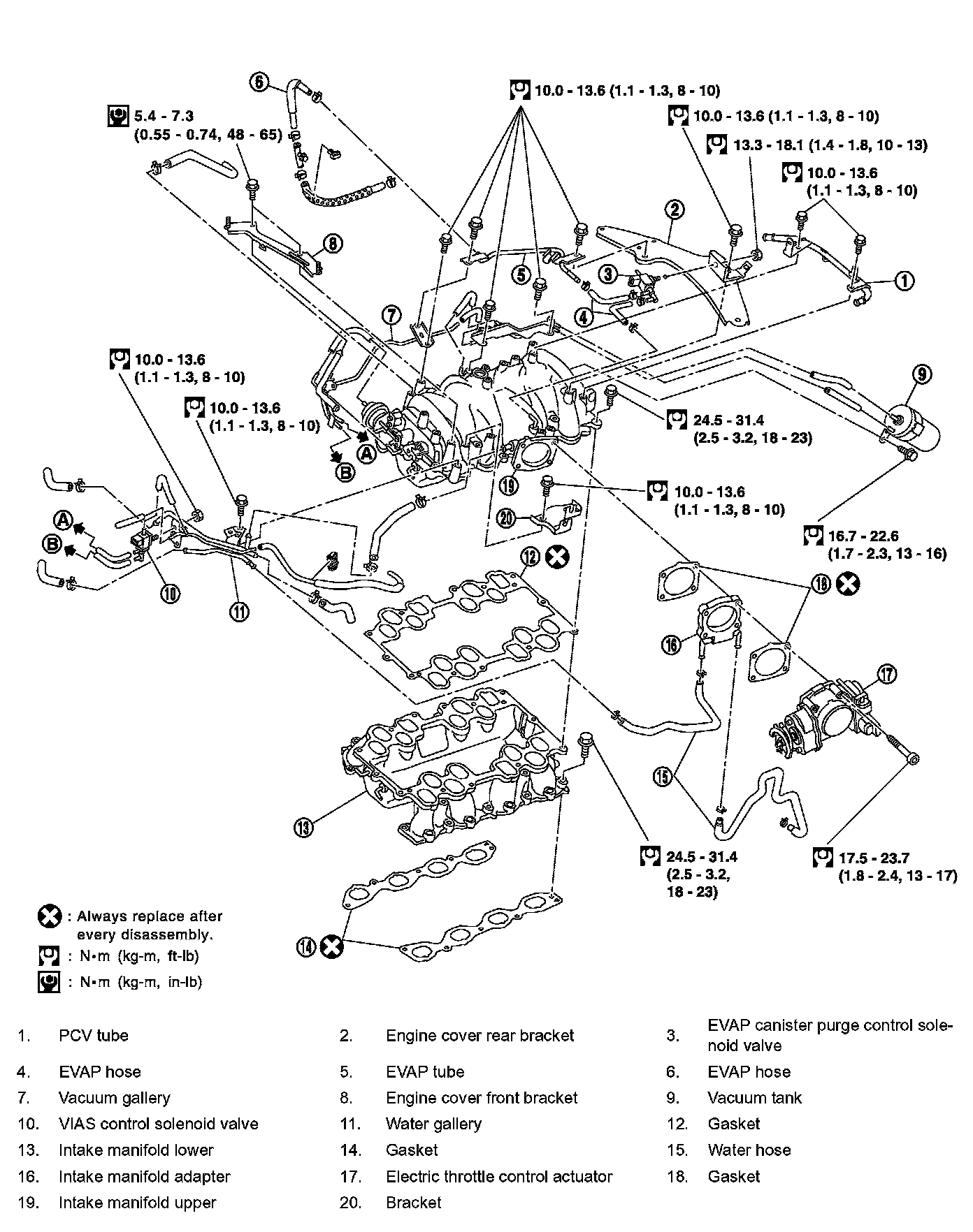 Intake manifold upper 24.5 - 31.4 Nm (2.5 - 3.2 kg-m, 18 - 23 ft. lbs.)