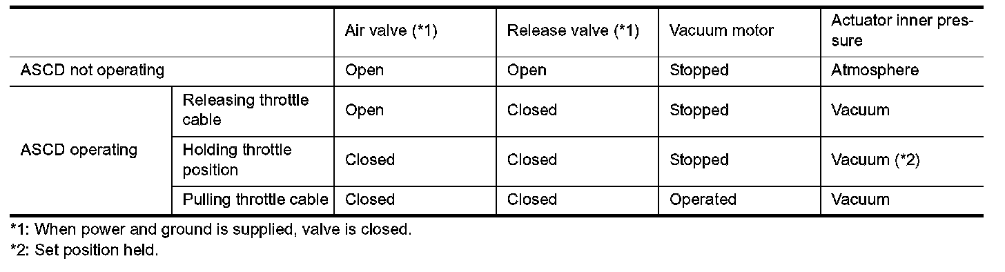 Ground is supplied to vacuum motor, air valve and release valve from ASCD control unit depending on the operated condition as shown in the table.