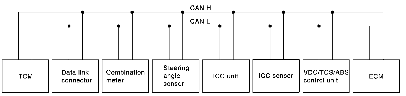 CAN (Controller Area Network) is a serial communication line for real time application. It is an on-vehicle multiplex communication line with high data communication speed and excellent error detection ability Many electronic control units are equipped onto a vehicle, and each control unit shares information and links with other control units during operation (not independent). In CAN communication, control units are connected with 2 communication lines (CAN line, CAN L line) allowing a high rate of information transmission with less wiring. Each control unit transmits/receives data but selectively reads required data only.