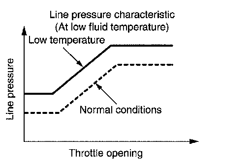 When the A/T fluid temperature drops below the prescribed temperature, in order to speed up the action of each friction element, the line pressure is set higher than the normal line pressure characteristic.