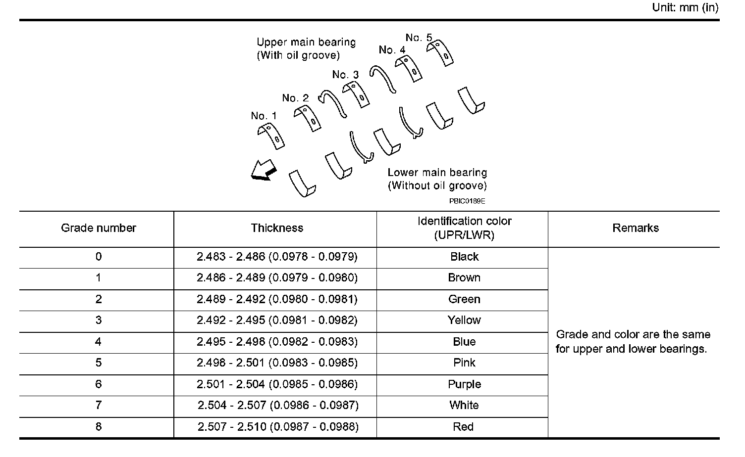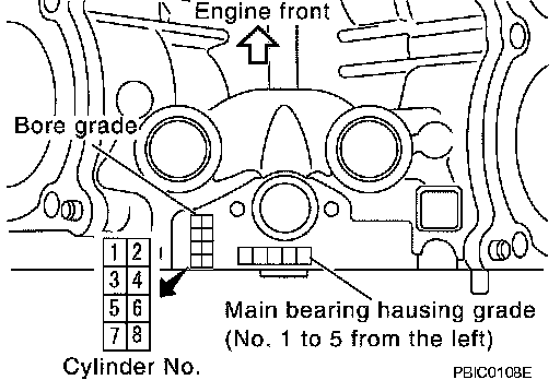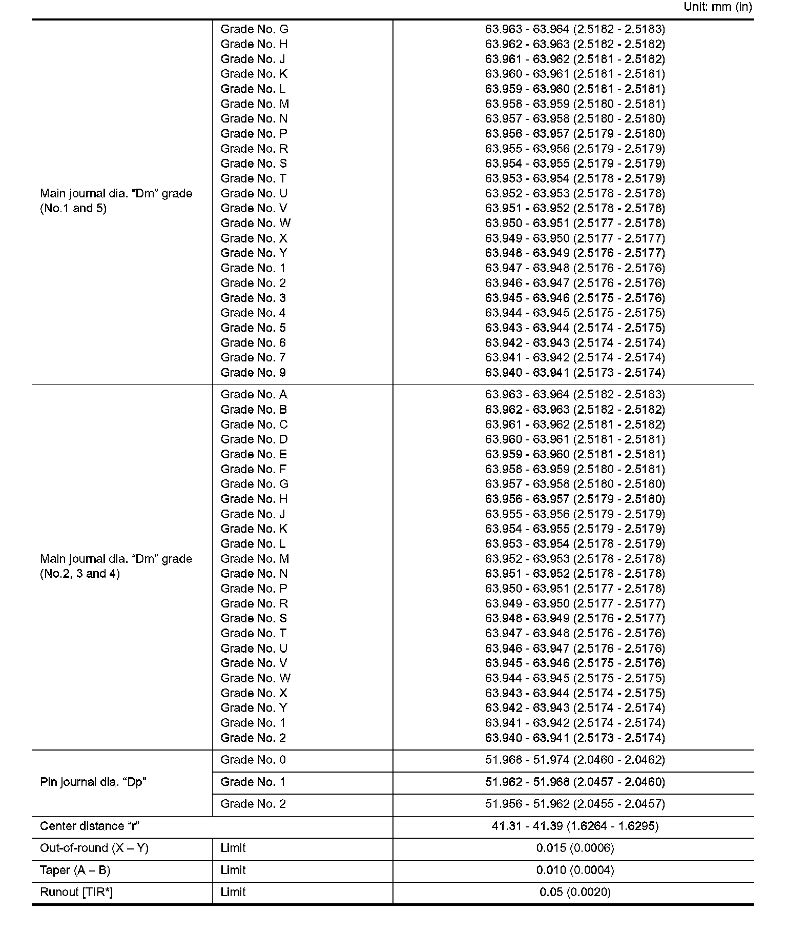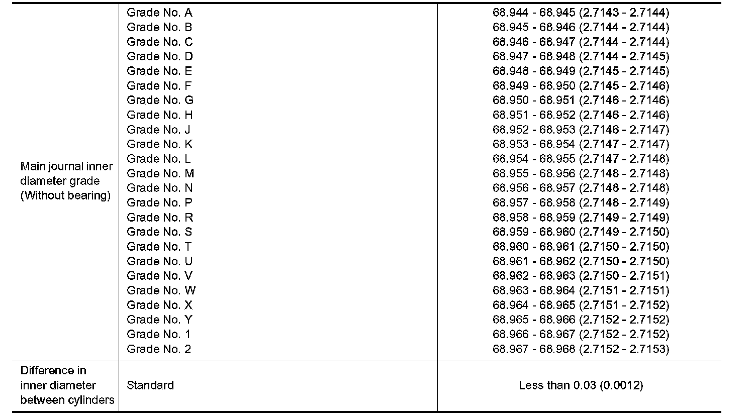 ^ If the measured value exceeds the repair limit, select main bearings referring to the main bearing inner diameter and crankshaft journal outer diameter, so that the oil clearance satisfies the standard. Refer to "HOW TO SELECT MAIN BEARING".