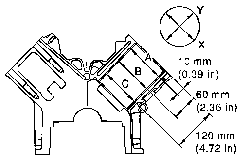 ^ Using a bore gauge, measure cylinder bore for wear, out-of round and taper at 6 different points on each cylinder. (X and Y directions at A, B and C)