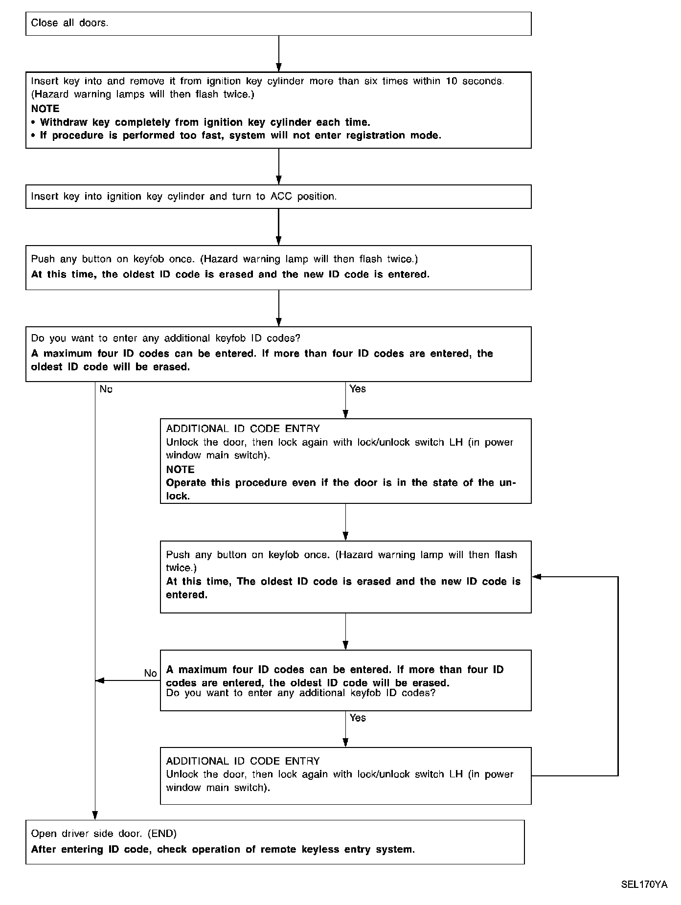 * When registering an additional keyfob, the existing ID codes in memory may or may not be erased. If four ID codes are stored in memory, when an additional code is registered, only the oldest code is erased. If less than four ID codes are stored in memory, when an additional ID code is registered, the new ID code is added and no ID codes are erased.