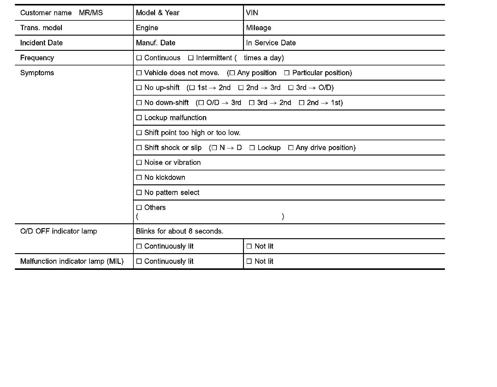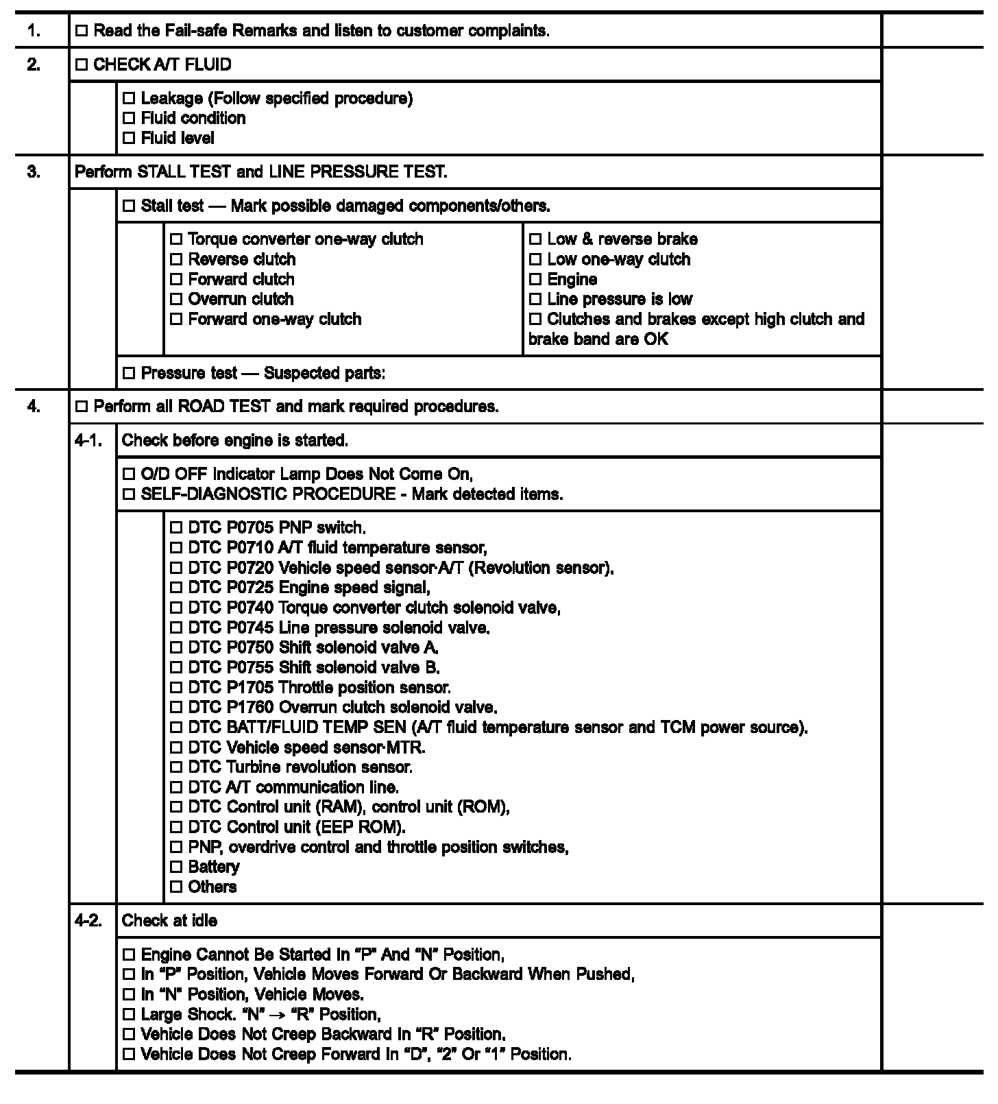 Input and output signals must always be correct and stable in the operation of the A/T system. The A/T system must be in good operating condition and be free of valve seizure, solenoid valve malfunction, etc.