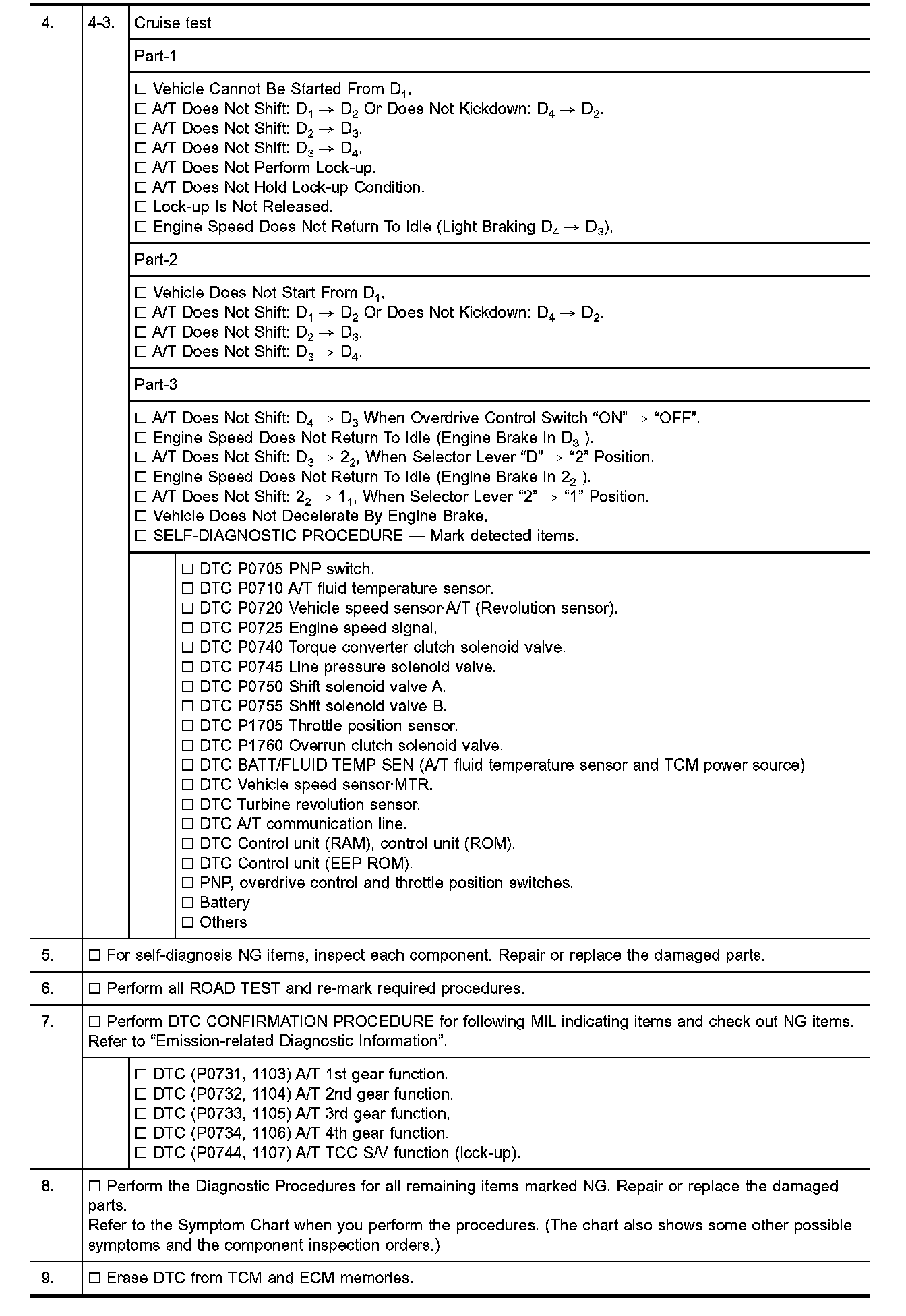 A visual check only may not find the cause of the incidents. A road test with CONSULT-II (or GST) or a circuit tester connected should be performed. Follow the "Work Flow".