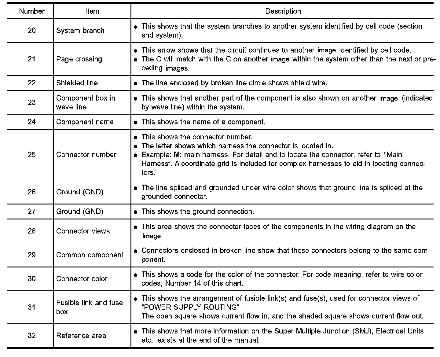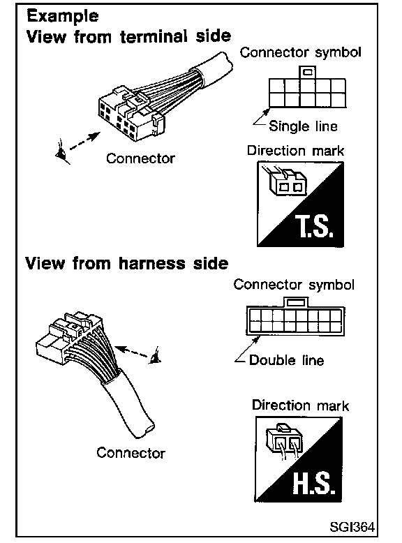 - Connector symbols shown from the harness side are enclosed by a double line and followed by the direction mark.