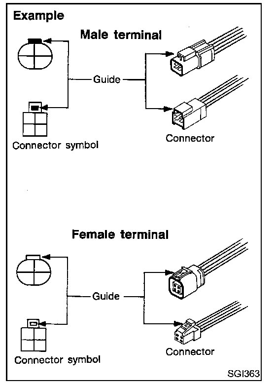 Connector guides for male terminals are shown in black and female terminals in white in wiring diagrams.