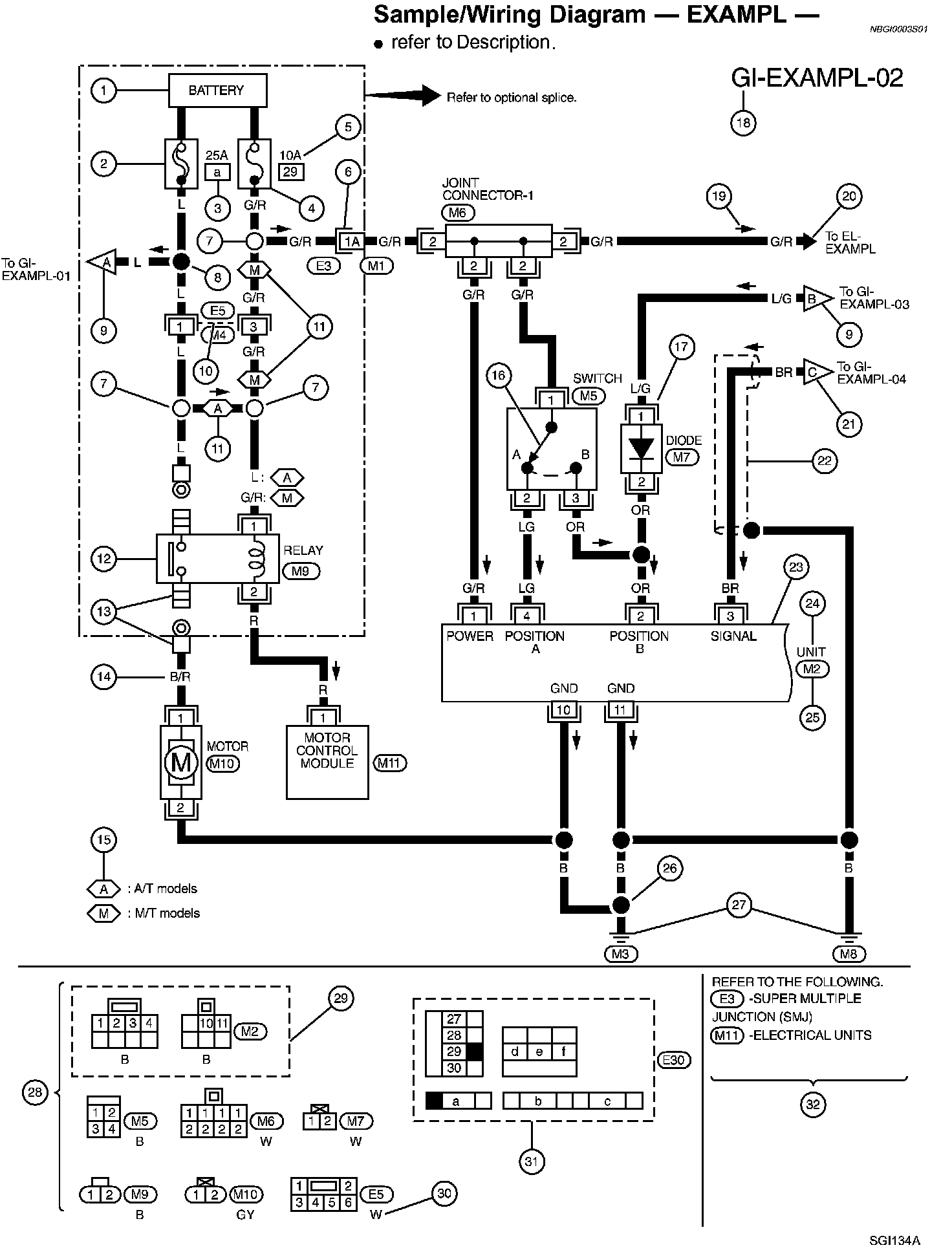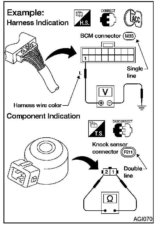 - A line with regular weight (wider line) represents "a detectable line for DTC (Diagnostic Trouble Code)". "A detectable line for DTC" is a circuit in which ECM (Engine Control Module) can detect its malfunctions with the on board diagnostic system.