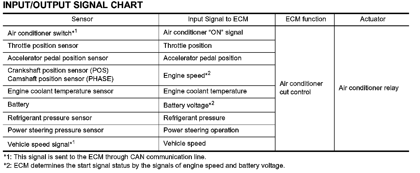 Air Conditioning Cut ControlAir Conditioning Cut Control Input/output Signal Chart:
