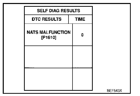 IVIS (Infiniti Vehicle Immobilizer System - NATS)- If the security indicator lights up with the ignition switch in the ON position or "NATS MALFUNCTION" is displayed on "SELF-DIAG RESULTS" screen, perform self-diagnostic results mode with CONSULT-II using NATS program card. Refer to "IVIS (INFINITI VEHICLE IMMOBILIZER SYSTEM-NATS)". Infiniti Vehicle Immobilizer System (IVIS ) - NATS