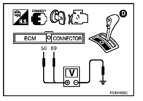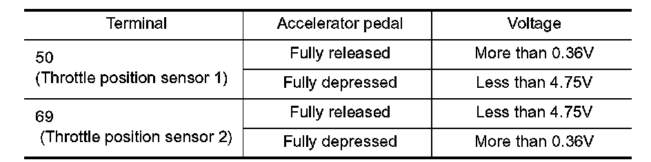 5. Check voltage between ECM terminals 50 (TP sensor 1signal), 69 (TP sensor 2signal) and engine ground under the given conditions.