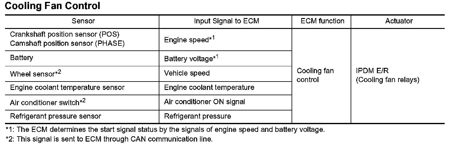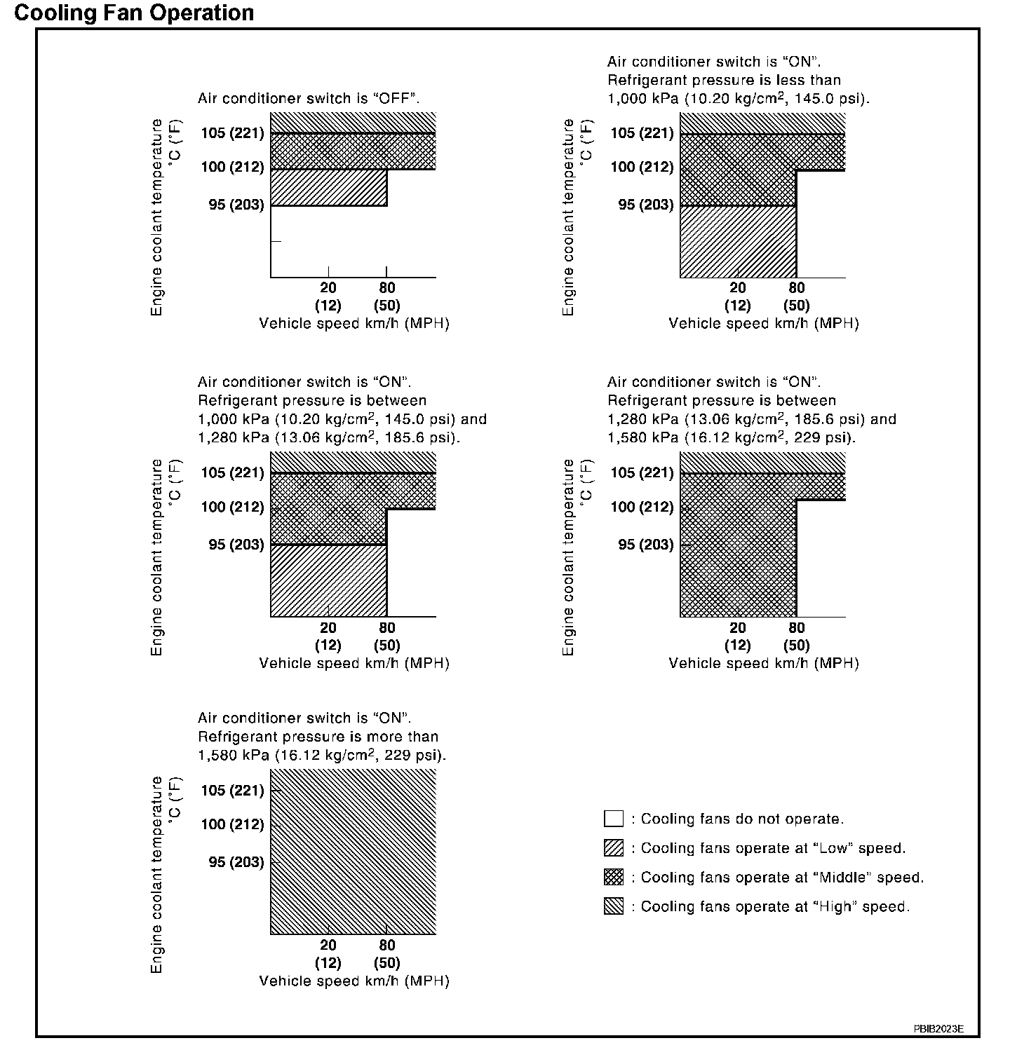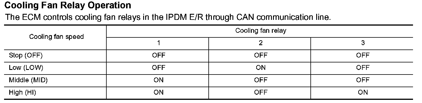 The ECM controls the cooling fan corresponding to the vehicle speed, engine coolant temperature, refrigerant pressure, and air conditioner ON signal. The control system has 4-step control [HIGH/MIDDLE/LOW/OFF].