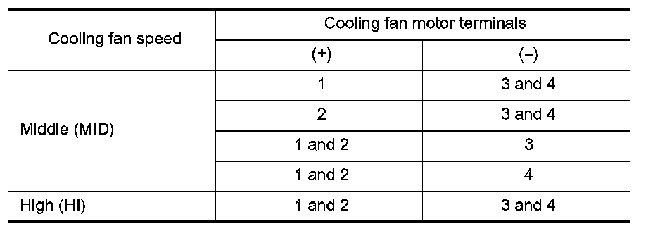 The cooling fan operates at each speed when the current flows in the cooling fan motor as follows.