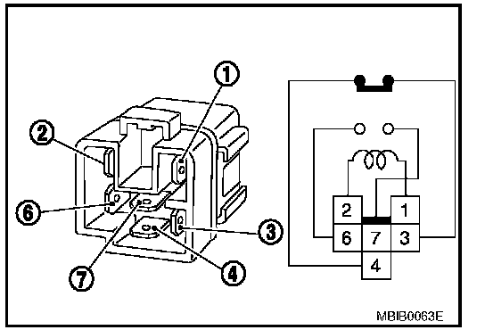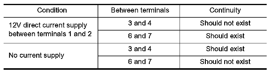2. Check continuity between relay terminals 3 and 4, 6 and 7 under the given conditions.