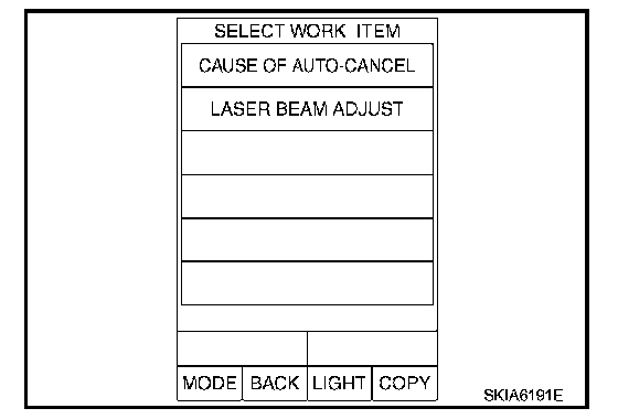 CAUTION: Complete all the procedures once "LASER BEAM ADJUST" mode is entered in CONSULT-II. When the procedure is discontinued, the ICC system is inoperable.