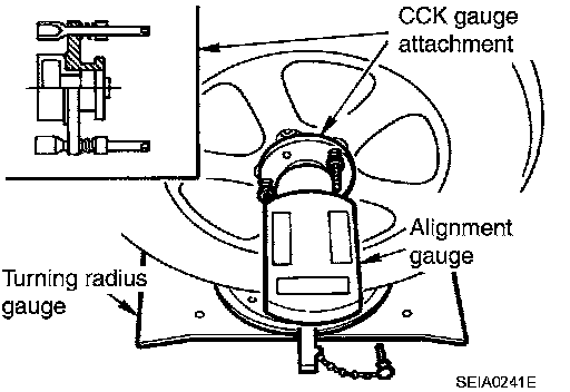 ^ Before inspection, mount front wheels onto turning radius gauge. Mount rear wheels onto a stand that has same height so vehicle will remain horizontal.